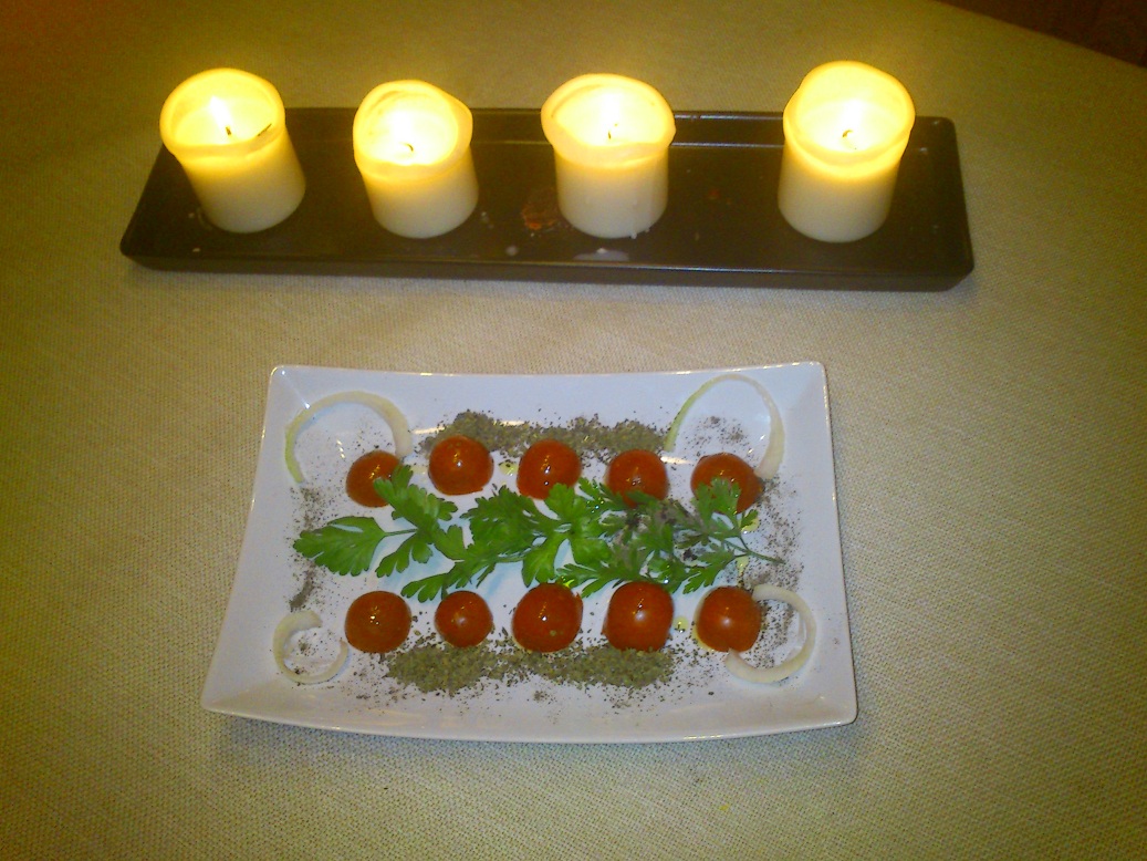 Marny los spotkał pomidorki. Skończyły na talerzu, będą zjedzone z cebulą i bazylią. Przed konsumpcją zostały polane oliwą i octem balsamicznym.