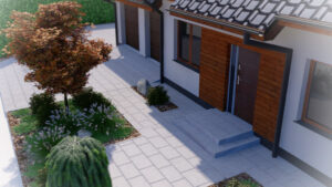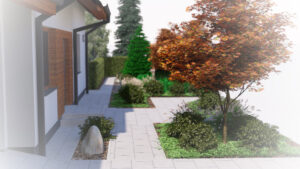 Od tarasu do altany zostanie poprowadzona kamienna ścieżka. Podobne ścieżki można poprowadzić od tylnego wyjścia z domu w stronę trawnika oraz w narożniku ogrodu gdzie poprzez rabatę można dojść do zacisznego zakątka. Tam pod posadzoną wierzbą płaczącą postanie ławka ogrodowa oraz element ozdobny. Charakteru temu miejscu dodaje prowadzący tam kamienny strumień (może być zarówno prawdziwy jak i tzw. sucha rzeczka bez wody).