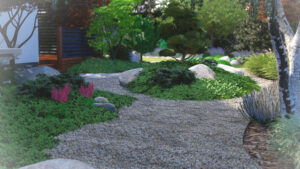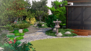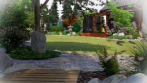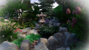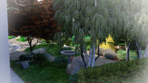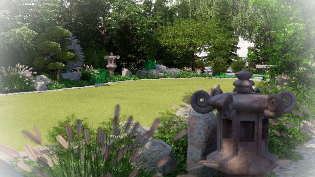 Szczególną uwagę będzie zwracać zaprojektowana tam sosna przycięta w stylu niwaki. Uzupełnieniem tych kompozycji są zielone rośliny w tym kwitnące azalie.