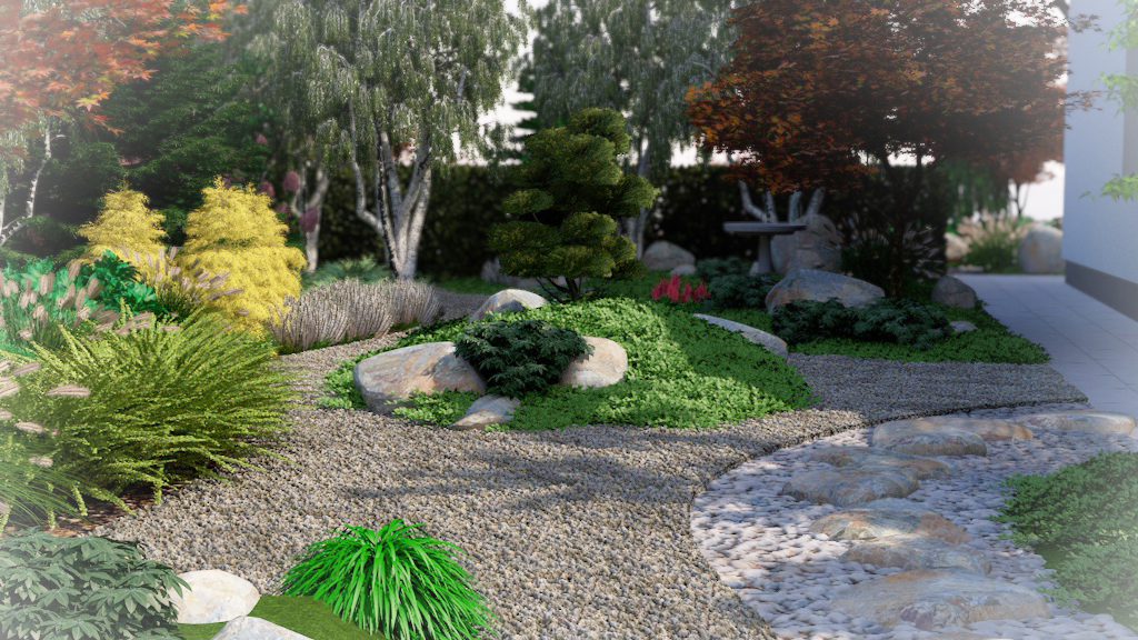 Przedstawiony projekt powstał z przekształcenia istniejącego już ogrodu. W nowej odsłonie inspirowano się ogrodami japońskimi, które cechuje naturalność, minimalizm i harmonia.