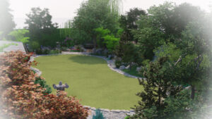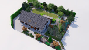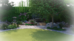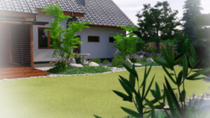 Obrzeże trawnika wyznaczać będą płaskie kamienie. Trawnik swoim kształtem nawiązywać będzie do zbiornika wodnego, wokół którego zostanie wysypany jasny kamyczek. Zaprojektowane w nim roślinne kompozycje usytuowane są na lekkich wzniesieniach i uzupełnione elementami kamiennymi.