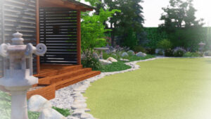 W ogrodzie japońskim nie brakuje zieleni, drzew formowanych w fantazyjne kształty oraz elementów dekoracyjnych jak np. latarenki i małe rzeźby.
